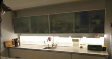 Twee dubbele bovenkasten uit een keuken. Met melkglas schuifdeurtjes en ingebouwde spotjes. De kasten zijn al gedemonteerd. De spotjes werkte voor demontage maar heeft even wat nakijk werk nodig kunne