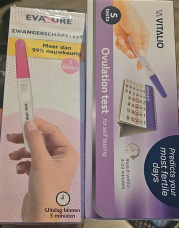 Een pakket met ovulatietesten en een zwangerschapstest. De ovulatietesten zijn van vitalio, 5 stuks. De zwangerschapstest is van eva sure, 1 stuk. Niet meer nodig hier.
