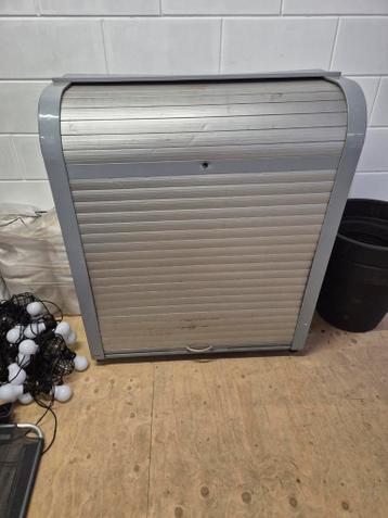Grijze roldeurkast, ideaal voor het opbergen van spullen die uit het zicht moeten. Het slot ontbreekt, maar de kast is verder functioneel. De kast is vrij licht en daardoor gemakkelijk te vervoeren en