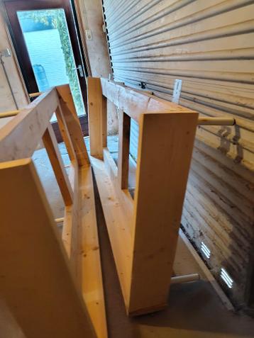 Eenvoudig bed met houten rand op pootjes. In twee delen.