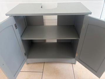 Mooie grijze wastafelonderkast met twee deuren en een plank, ideaal voor het opbergen van badkamerspullen. De kast is in goede staat en past onder de meeste standaard wastafels. Perfect om uw badkamer