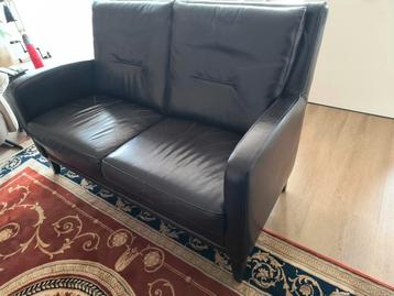 Comfortabele tweezitsbank in bruin leer. De bank is gebruikt en heeft lichte gebruikssporen, maar is nog in goede staat voor een tweede ronde. Ideaal voor een kleinere woonkamer of als aanvulling op e