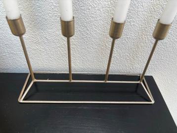 Deze kandelaar is gemaakt van metaal en heeft een gouden kleur. Er passen vier kaarsen in. De kandelaar heeft een minimalistisch design en is geschikt voor smalle kaarsen.