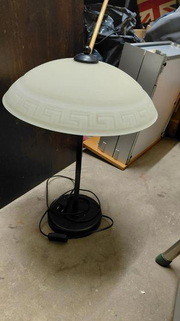 Deze tafellamp heeft een glazen kap met een patroon. De voet en de steel zijn zwart. Er zit een snoer aan met een schakelaar. Werkt naar behoren. Weg wegens andere kap zit vast gedraaid maar beweegt i