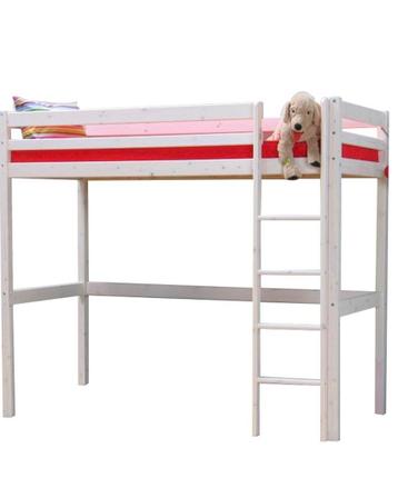 Mooie hoogslaper in lichte houtkleur (white wash). Deze hoogslaper biedt ruimte voor een bureau of opbergruimte (ruim 200 cm lang). Door de open structuur en lichte kleur lijkt de hoogslaper weinig ru
