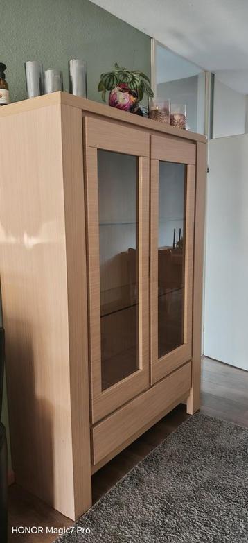 Mooie vitrinekast met glazen deuren, een handige lade en twee glazen plateaus en voorzien van verlichting. De kast is nog in goede staat, met lichte beschadigingen die te zien zijn op de laatste twee