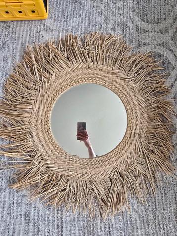 Mooie rieten spiegel, ongeveer een meter breed. De spiegel zelf heeft een diameter van circa 30 cm. Ik gebruik hem zelf niet meer en bied hem gratis aan voor een tweede kans.