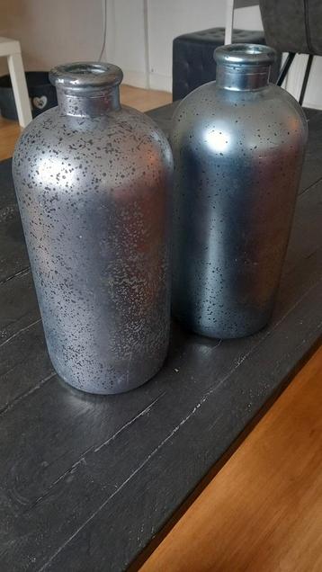 Twee prachtige zilverkleurige vazen met een uniek gespikkeld design.