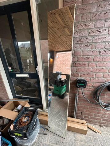 Spiegel van 199 cm hoog en 35 cm breed. Bevestigd op een houten plank (voorheen kastdeur). Wat beschadigingen maar prima voor in de garage bijv.