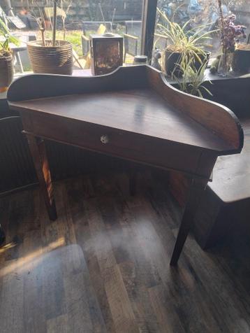 Houten hoek tafeltje met lade rechter zijkant/rand is gebarsten/gerepareerd. Maar wanneer deze in een hoek staat zie je daar weinig van