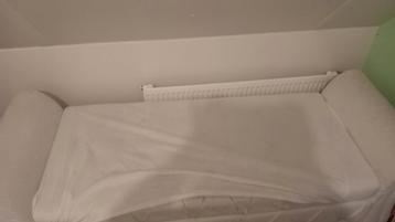 Handig bankje met ingebouwde opslagruimte, perfect voor het opbergen van dekens, kussens of andere spullen. Het bankje is gebruikt dat is op de fotos te zien, klein hoeslakentje kan het zitgedeelte al