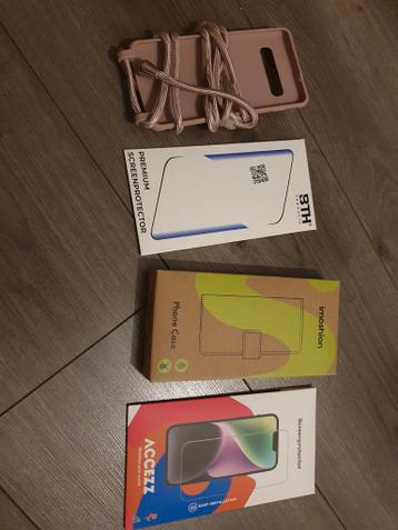 Diverse telefoonaccessoires aangeboden: een roze siliconen hoesje met koord voor de samsung galaxy s10e, een imoshion telefoonhoesje (voor een samsung galaxy a 41), een bth premium screenprotector en