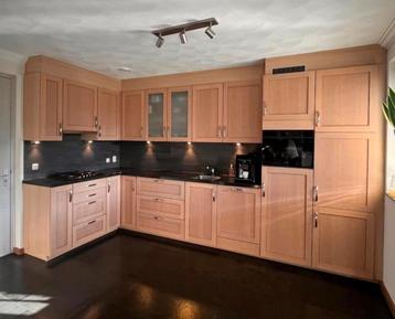 Prachtig massief eiken keuken nog volledig in zeer goede staat. Afmetingen zijn: lengte lange kant 418 cm lengte korte kant 180 cm hoogte werkblad 98 cm totale hoogte incl. Afwerk rand bovenzijde 260