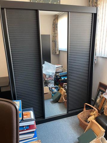 Twee zwarte kledingkasten gratis af te halen. De ene kast heeft schuifdeuren, waarvan één met spiegel. De andere kast heeft drie deuren. Ideaal voor extra opbergruimte in de slaapkamer of een andere r