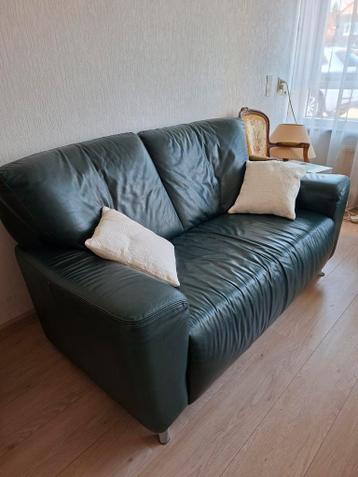 Mooie en comfortabele donkergroene leren bank te koop. De bank is gebruikt, maar verkeert nog in goede staat en biedt plaats aan twee tot drie personen. Ideaal voor een gezellige zithoek. Afmetingen: