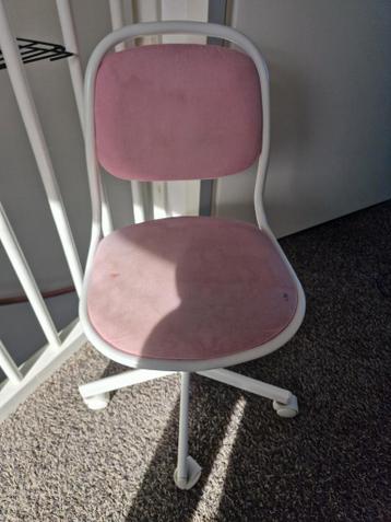 Gebruikte roze kinder bureaustoel. De stoel heeft enkele vlekken, zoals te zien op de foto's, maar is verder functioneel en kan nog prima een ronde mee. Ideaal voor een kinderkamer of studeerhoek.