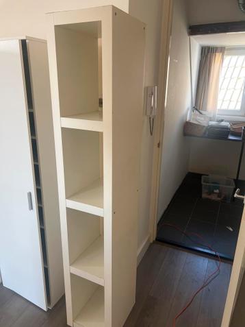 Handige smalle witte kast met open vakken, ideaal voor het opbergen van boeken, decoratie of andere spullen. De kast is 190 cm hoog, 35 cm breed en 38 cm diep, waardoor hij perfect is voor kleinere ru