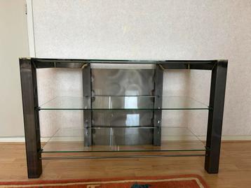 Stevig en modern tv- of audiomeubel met een frame van metaal en drie glazen planken. Het meubel biedt voldoende ruimte voor al uw apparatuur en is een stijlvolle toevoeging aan elk interieur. Het meub
