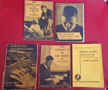 Een set van 5 vintage kanarie-boekjes, elk met een uniek thema: 'zo moeten ouders met kinderen omgaan' (nr. 177), 'wat opgroeiende jongens moeten weten' (nr. 74), 'karakters doorgr