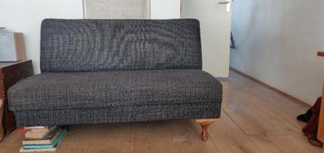 Mooie bank bekleed met top kwaliteit stof van ploeg bekleed. Een pot is afgebroken, wij zitten met een stapel boeken onder de hoek stevig. Zitting/vering in perfecte staat. Zithoogte 42cm, zitdiepte 5