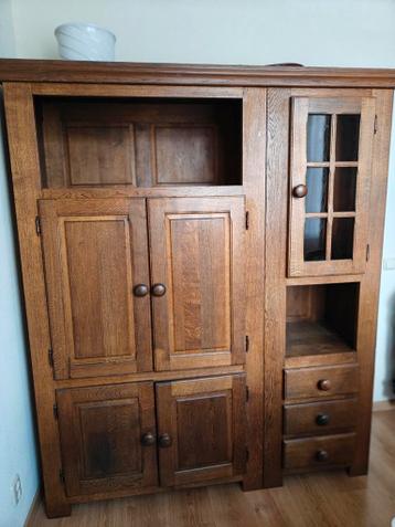 Mooie, robuuste 3-delige eiken kast die ook als één geheel te plaatsen is. De kast biedt veel opbergruimte met een combinatie van deuren, lades en open vakken. Ideaal voor de woonkamer, eetkamer of ha