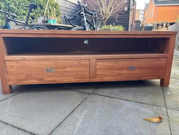 Eiken tv meubel met een breedte van 160 cm, hoogte van 55 cm en diepte van 55 cm. Het meubel is voorzien van twee handige laden en een open tussenvak voor bijvoorbeeld een mediabox. Het blad is lichte