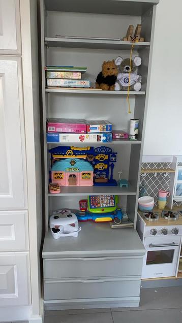 Mooie grijze kast met open planken en twee lades. Ideaal voor de kinderkamer of speelhoek. De kast is gebruikt, maar in goede staat. Kan deze week gratis worden opgehaald.