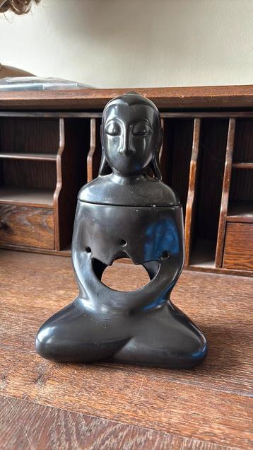 Beeldje van mediterende mensfiguur in zwart aardewerk. In de buik brandt een waxinelichtje. Bovenin, onder het hoofd, kan eventueel zo’n geurtablet. 24 Cm hoog. Leuk als cadeautje. Ophalen in rotterda