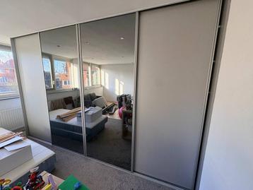 Ruime kledingkast met twee schuifdeuren met spiegel. De kast is voorzien van zowel hangruimte als meerdere planken, ideaal voor het opbergen van diverse kledingstukken en accessoires. De kast is in go