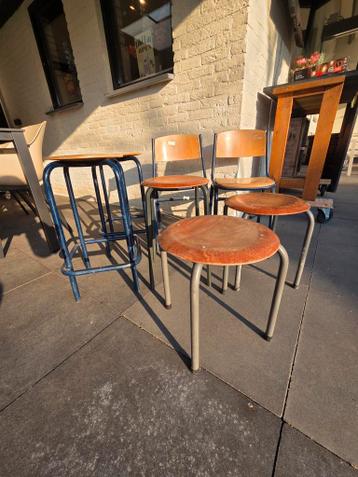 Deze set bestaat uit twee vintage schoolstoelen en vvijf ijpassende krukken. Ze zijn ideaal voor een speelse inrichting, een creatieve werkplek of als extra zitplaatsen. De stoelen en krukken hebben e