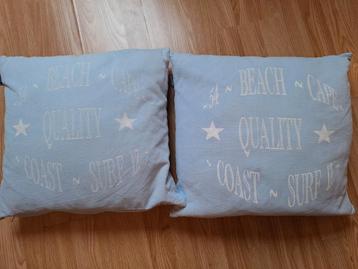 2 lichtblauwe sierkussens met tekst. Losse binnenkussens. In nette staat. Afmetingen 45x45