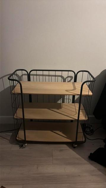 Mooi nacht kastje. Op wieltjes, 3 planken. Bovenste plank heeft wat vlekken van kaarsen erop en de onderste plank is wat krom getrokken. Ongeveer 80 breed en 1 meter hoog.
