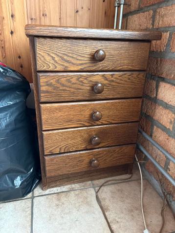Mooi houten ladekastje met vijf laden, ideaal voor extra opbergruimte in elke kamer. Het kastje is gemaakt van eikenhout en heeft een klassieke uitstraling. De laden zijn voorzien van ronde houten kno