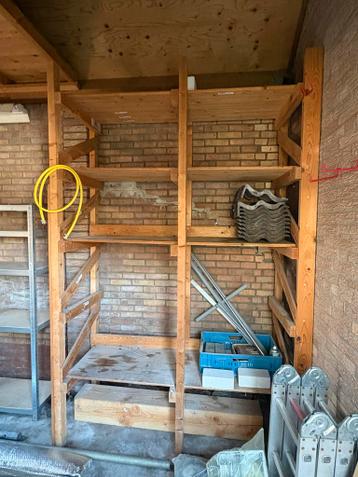 Robuuste houten stellingkast, ideaal voor opslag in een garage, schuur of werkplaats. De kast is 270 cm hoog, 176 cm breed en 68 cm diep en biedt veel opbergruimte. De stelling is gebruikt, maar nog i