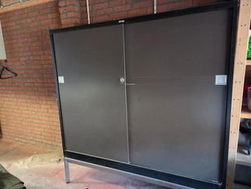 Gratis af te halen metalen kast met 2 schuifdeuren kleur donkerbruin staat op een onderstel 2 metalen schappen. Merk mewaf hoogte totaal 165 cm, kast is 133 cm hoog 155 cm breed 45 cm diep de kast sta