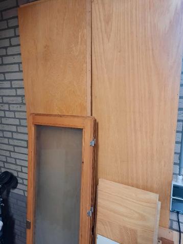 1 staander 220x30 cm bovenblad (voor 30 cm stelling) 44x95 cm 4 deuren (met glas) 50x149 4 kleinere deurtjes 40 x 48 cm schap 50x27: 5x schap 50x30: 4x diverse triplex achterwanden (zie foto) gratis a