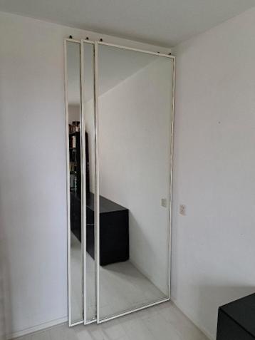 3 spiegels in metalen lijsten 240x75cm 1 spiegel is helaas gebarsten op 80 cm van de onderkant het zijn schuifdeuren van een gedemonteerd kast. Rails ook beschikbaar
