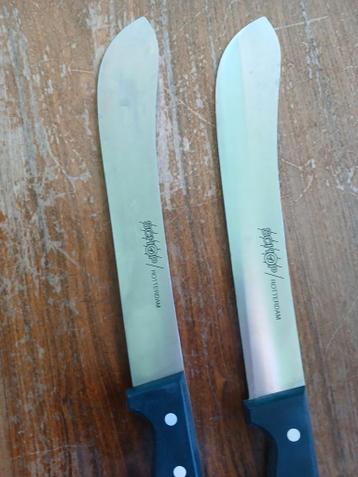 Set van twee mooie koks messen van het merk schop rotterdam. De messen zijn van prima kwaliteit en nooit gebruikt, dus zo goed als nieuw. Ze zijn ook per stuk te koop. De afmetingen zijn: lengte 38 cm