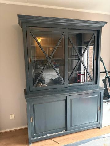 Mooie massief houten buffetkast in twee delen, ideaal voor het opbergen van servies of andere spullen. De kast is voorzien van praktische schuifdeuren en diverse planken, wat zorgt voor veel opbergrui