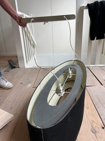 Eetkamer lamp, eclips vorm. Zwart stoffen bekleding. Twee lichtpunten, voor details zie foto. 95Cm lang, 30cm breedste punt.