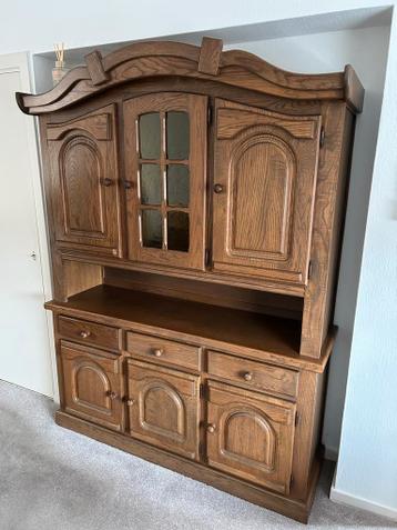 Prachtige massief eiken buffetkast, bestaande uit twee delen. De kast is 1.54 Meter breed en 2.06 Meter hoog. Een echte eyecatcher voor uw interieur! De kast biedt veel opbergruimte en is in goede sta