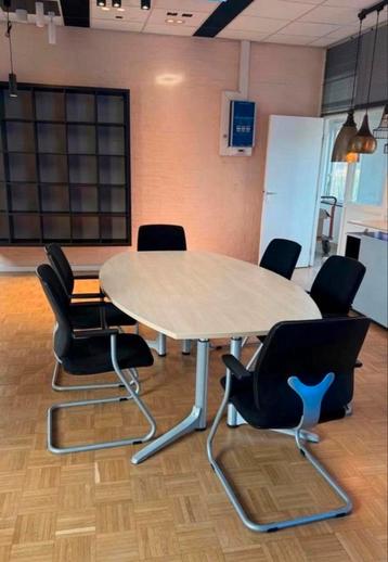 Complete vergaderset bestaande uit een ovale, verstelbare vergadertafel en zes bijpassende stoelen. De tafel heeft een lichtkleurig blad en een metalen onderstel. De afmetingen van de tafel zijn 120 x