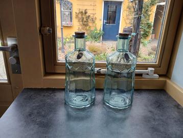 2 lichtblauwe glazen flessen. Van 1 fles is een stukje af maar dit valt niet erg op. Enkel ophalen.
