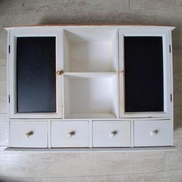 Leuk wit wandkastje met twee deurtjes (met krijtbord-inzet) en vier handige lades. Ideaal voor in de keuken, hal of kinderkamer. Het kastje is gebruikt, maar in goede staat en kan nog prima een ronde