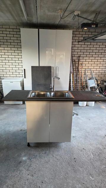 Keukenblad met twee roestvrijstalen wasbakken en een handig onderkastje. Ideaal voor een bijkeuken, garage of als extra werkblad. 179 Cm x 65 cm