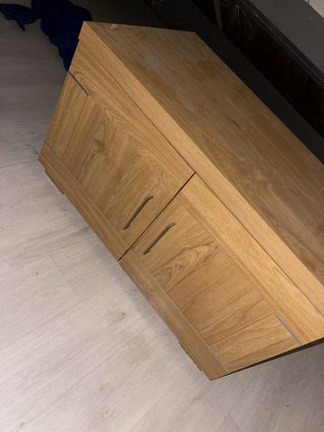 Mooi en functioneel eikenhouten tv-kastje, ideaal voor elke woonkamer. Het kastje biedt voldoende ruimte voor uw televisie en heeft handige opbergvakken voor media-apparatuur, afstandsbedieningen en a