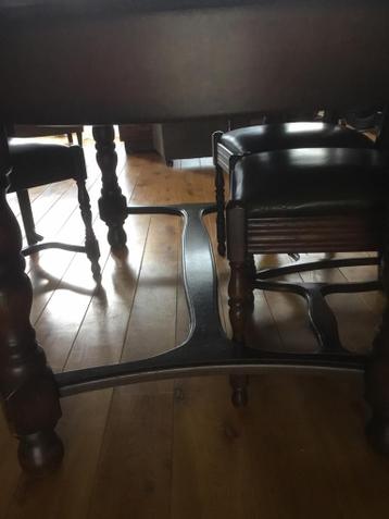Nog in prima staat zijnde donker eiken eethoek met leren bekleding, alleen kleine beschadiging op het tafelblad.