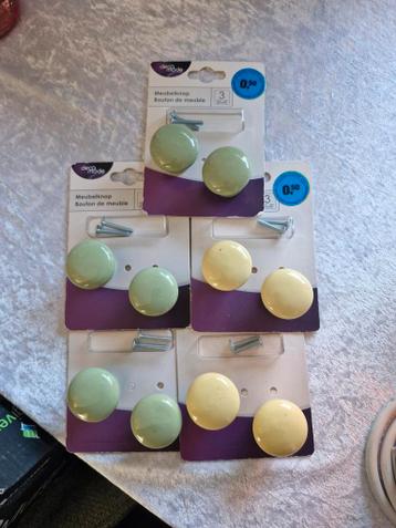 Set van 10 nieuwe meubelknoppen in frisse groene en gele kleuren. Perfect om je meubels een nieuwe look te geven. De knoppen zijn nog in de originele verpakking en inclusief schroeven. Ideaal voor lad
