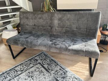 Veel gebruikte eetkamerbank met een suède look in een grijze kleur. Hier en daar gebruikerssporen. Zie laatste 2 foto’s. Bij de rugleuning is de plaat al wel te voelen. De bovenste plaat bij de rugleu