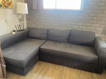 De bank heeft veel water vlekken maar zit voor de rest goed. Kan uitgeklapt worden tot slaapbank en heeft een extra ruimte om dingen in op te slaan.